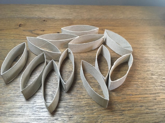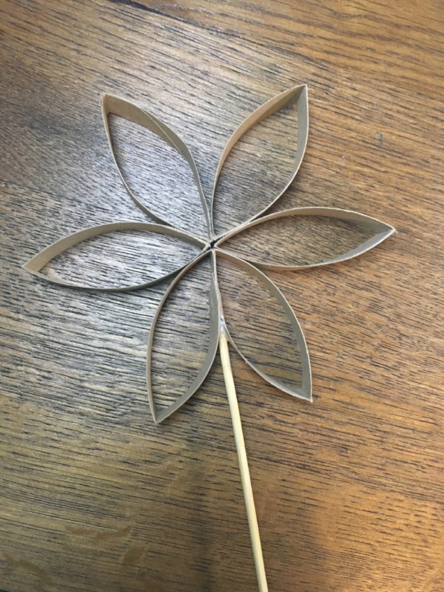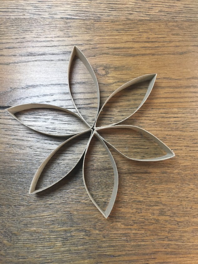 4. Klebe nun immer 6 Spitzen der Klorollen-Teile zusammen, sodass insgesamt zwei Blumen entstehen.