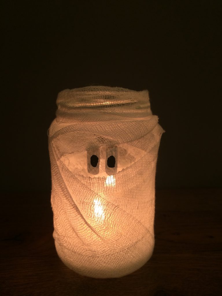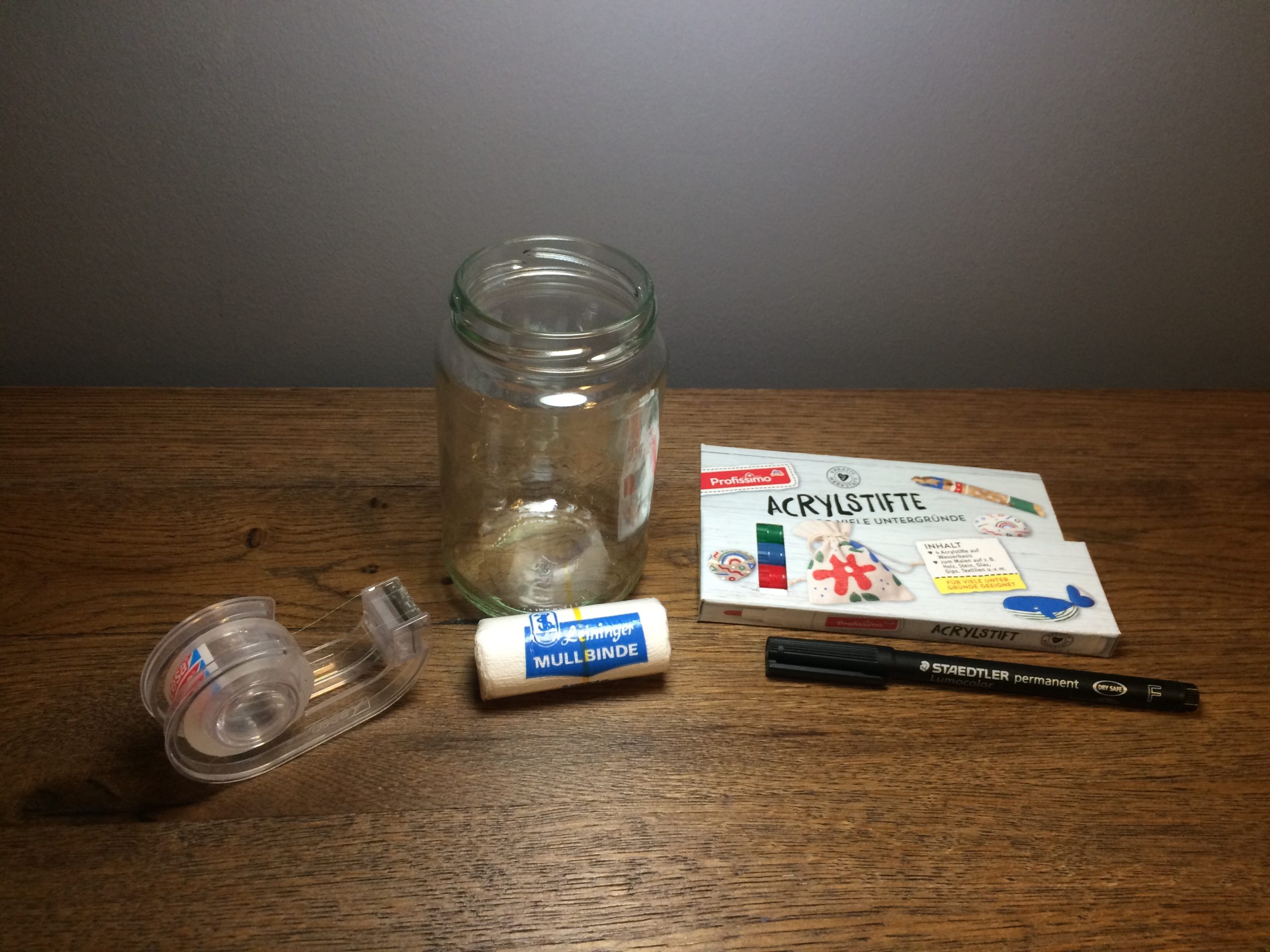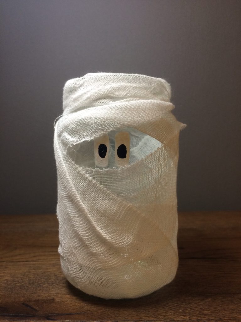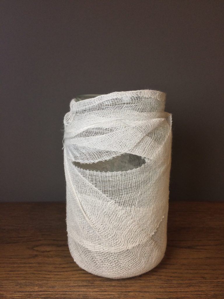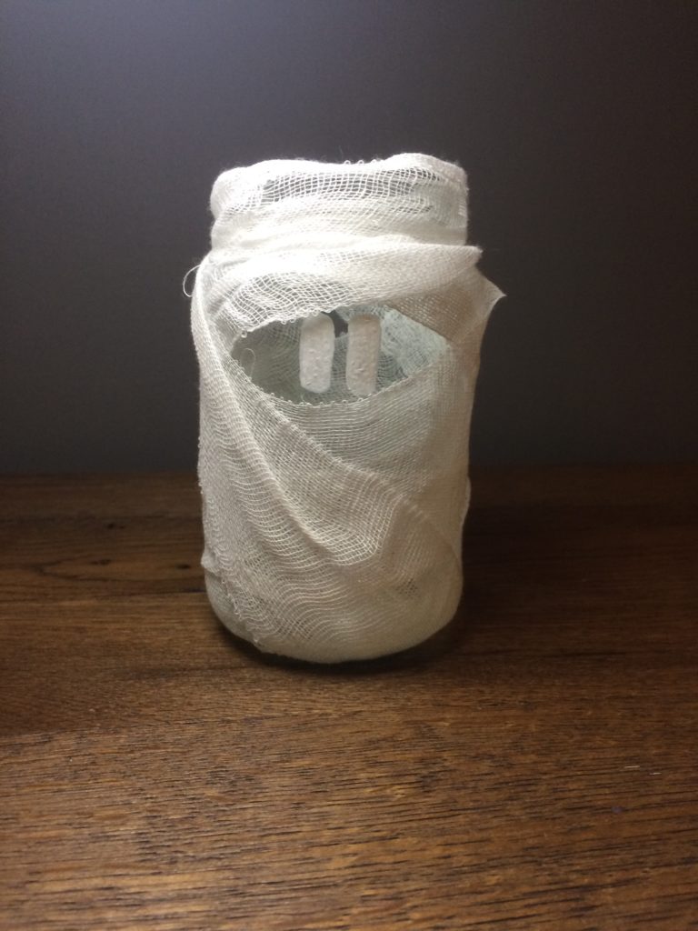 1. wickel die Mullbinde um das Glas und klebe die Enden mit Tesafilm fest. Lasse einen kleinen Spalt frei damit noch Platz für die Augen ist.