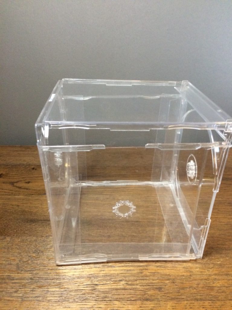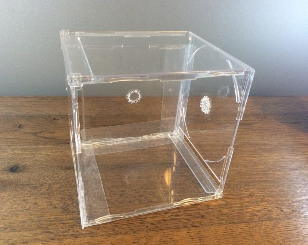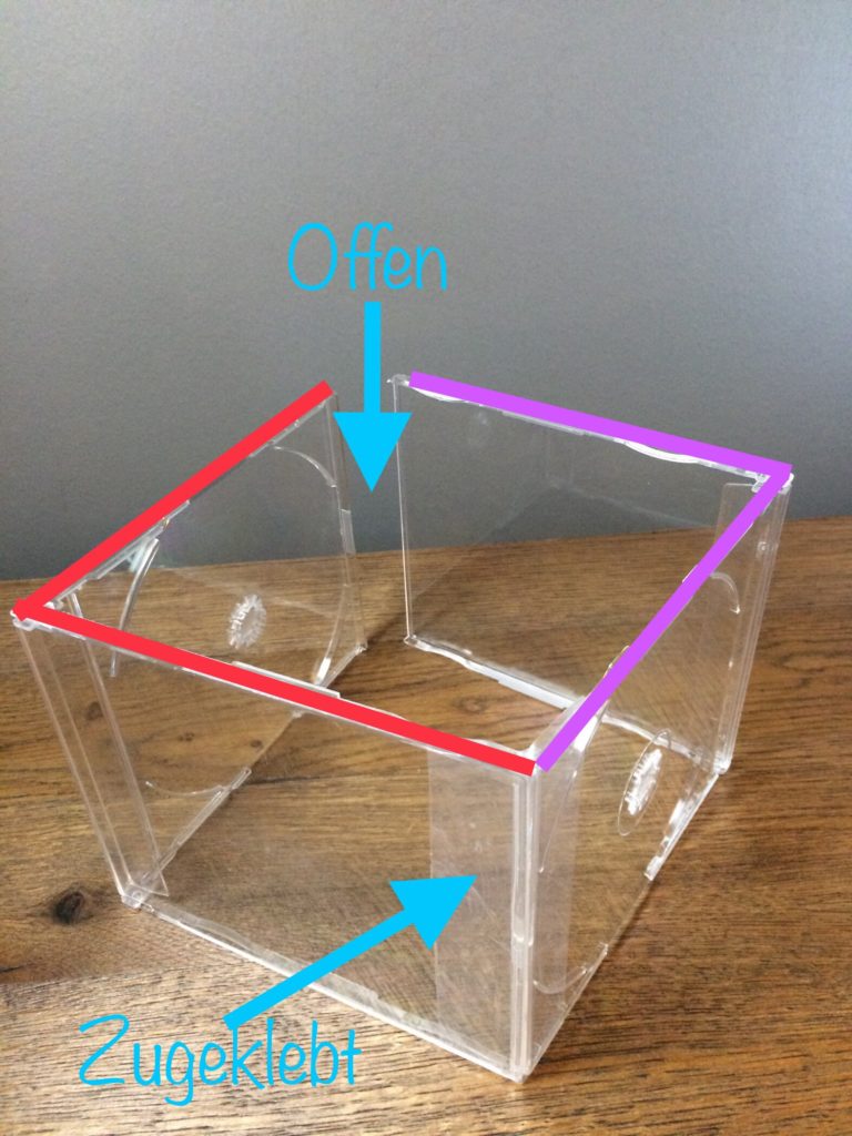3. Klebe die Hälfte der dritten CD Hülle (egal welche Seite) an die anderen CD Hüllen. In meinem Fall ist dies die vordere stehende Wand. Da CD Hüllen nicht quadratisch sind muss man sich entscheiden wo eine „Lücke“ entstehen soll, ich habe mich entschieden im oberen Bereich deshalb einen Lüftungsschlitz zu lassen.4. Wiederhole Vorgang 3 nochmal auf der anderen Seite. Dein Gewächshaus müsste nun die Form eines Würfels haben. 5. Wie du siehst gibt es leider einen (oder mehrere) Lüftungsschlitze. Die entweder offen lassen oder einfach auch zu kleben.Nun nur noch schnell Pflanzen rein, fertig!