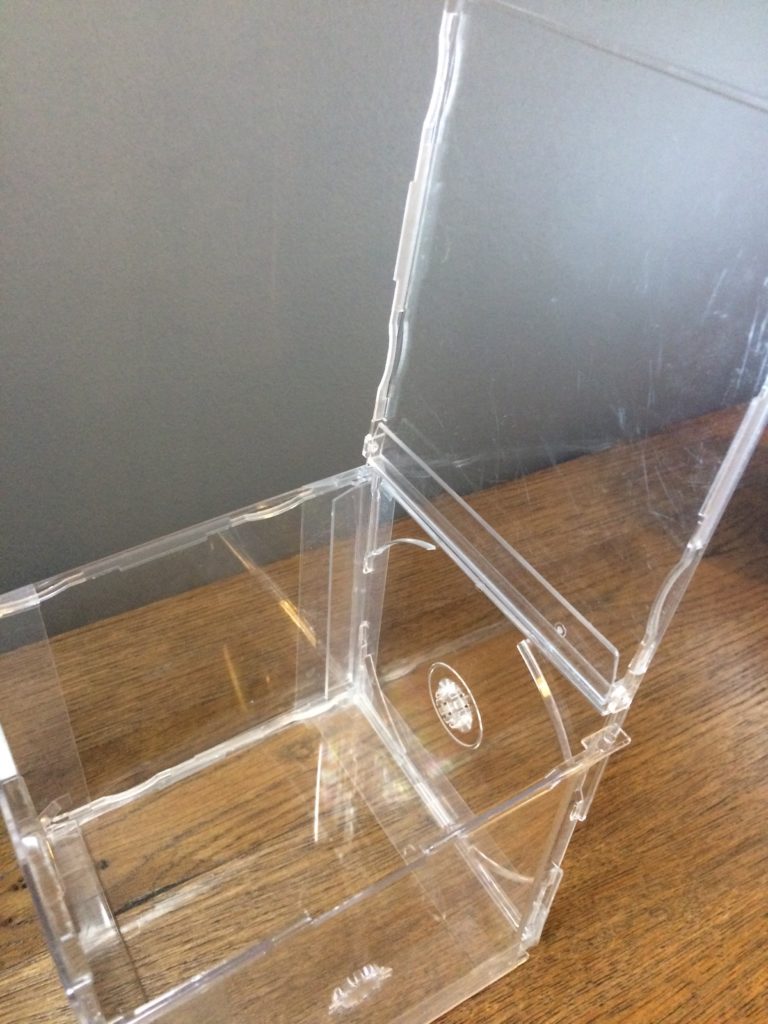 2.Teile die dritte CD Hülle in der Mitte aus einander (d.h der Deckel der Hülle und die Rückseite in die man die CD legt werden getrennt), so dass du zwei separate Wände erhältst.